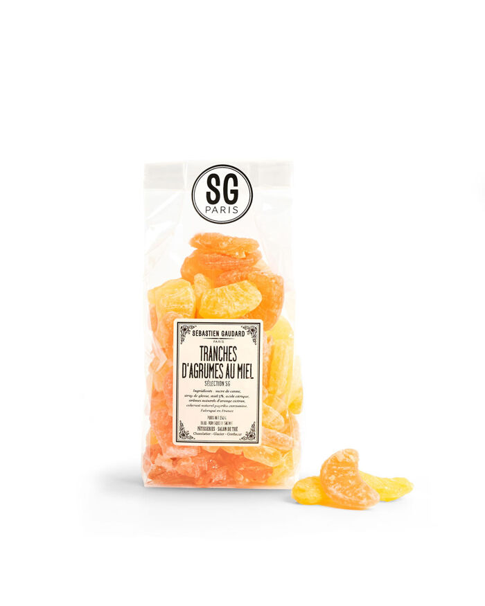 Fabriqués en France, ces bonbons de sucre cuits au miel sont aromatisés au citron et à l'orange.